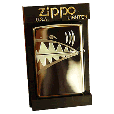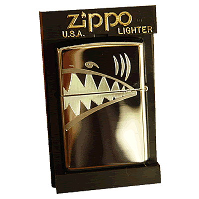 Zippo messing-poliert mit Diamantgravur. Die Gravur wurde auf Klappe und unteren Teil ("Body") ausgeführt. Beim Öffnen der Klappe öffnet sich auch das Maul des Hais.